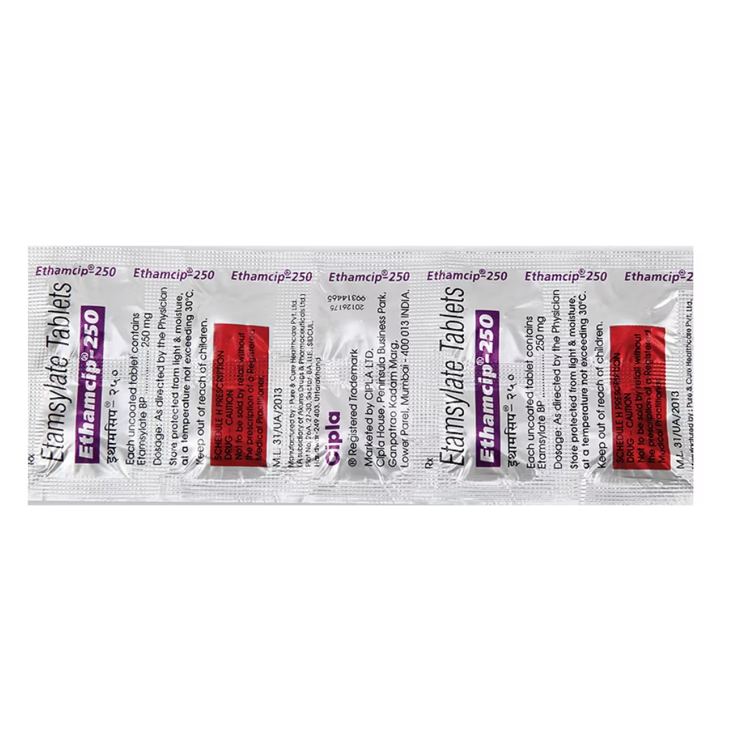 Ethamcip 250mg Tablet is a hemostatic medication. It acts by increasing the ability of platelets to stick together and helps in the formation of blood clots. It also helps in controlling bleeding from capillaries which are tiny blood vessels. Take it in the exact dose and duration as prescribed by the doctor to get the maximum benefits.