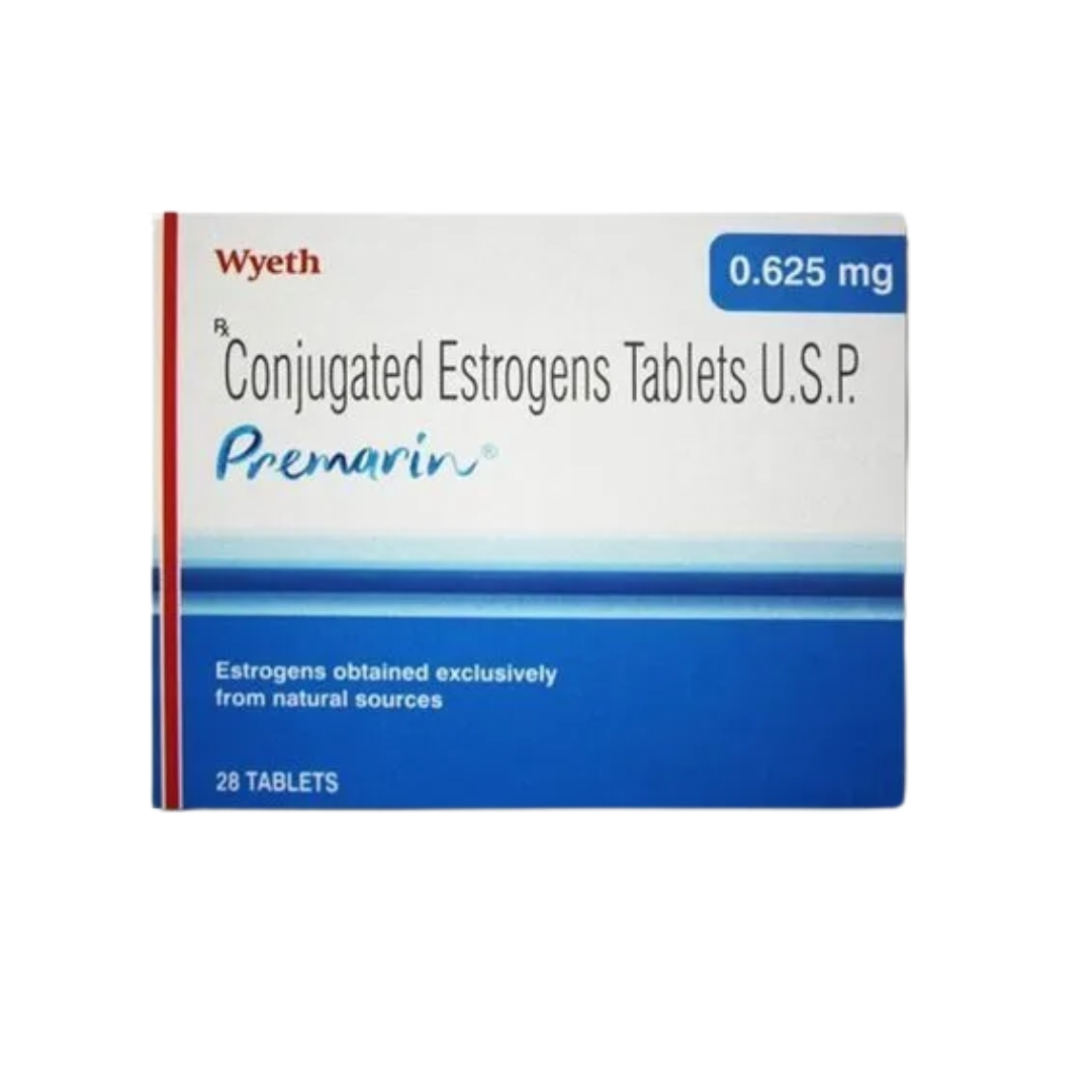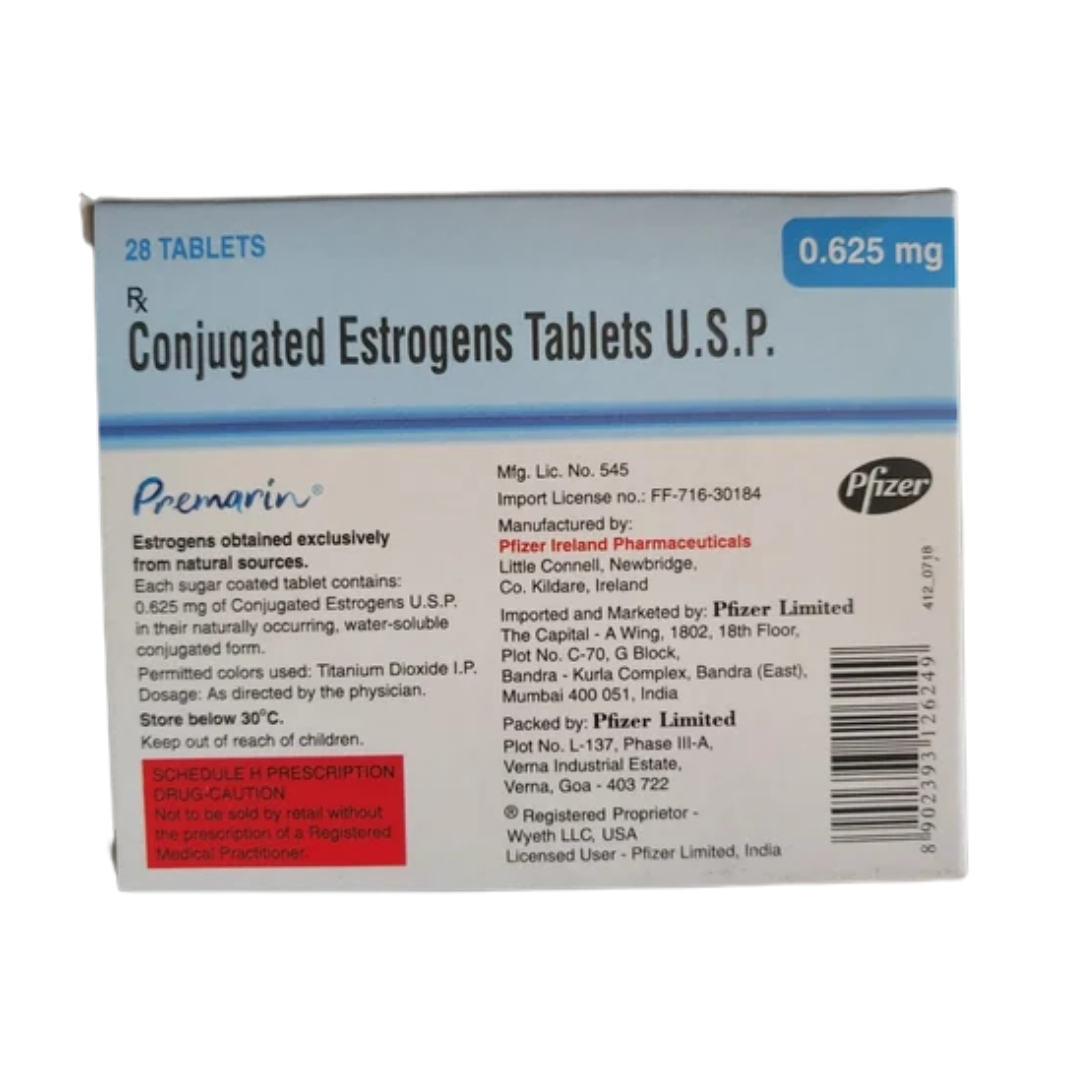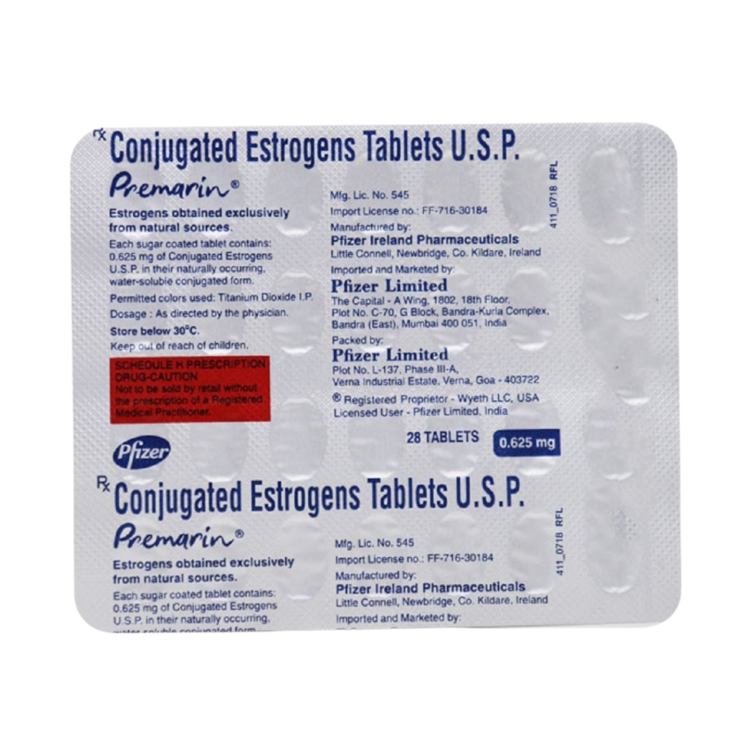 Premarin 0.625mg Tablet is a female sex hormone (estrogen). It is a part of female hormone replacement therapy which helps in treating estrogen deficiency symptoms like hot flushes (red and warm face) and vaginal dryness.In some cases, Premarin 0.3mg Tablet is also used to treat breast cancer and prostate cancer along with other anticancer medicines. It is to be taken at a fixed time(s) daily. The dose and duration will be decided by your doctor so that you get the right amount to control your symptoms. If you have missed a dose, take it as soon as you remember it. Do not skip any dose and finish the full course of treatment. The treatment should not be stopped abruptly without consulting your doctor as this may affect the potency of this medicine.