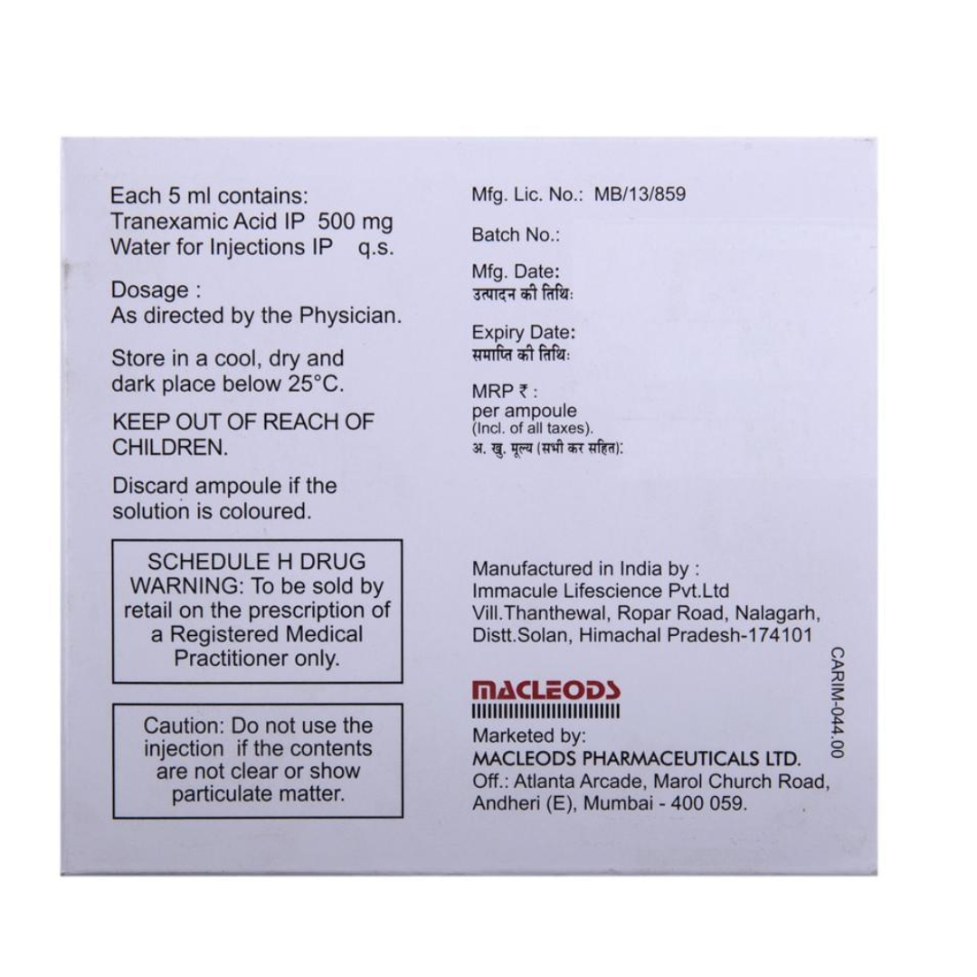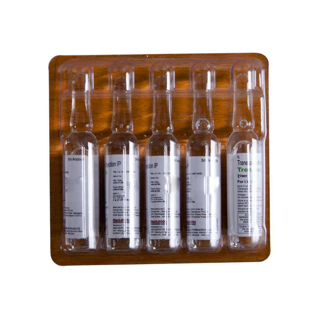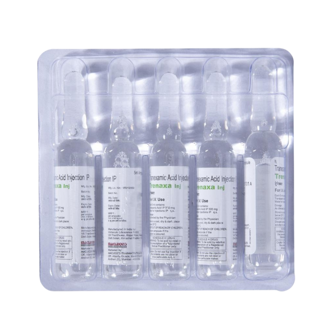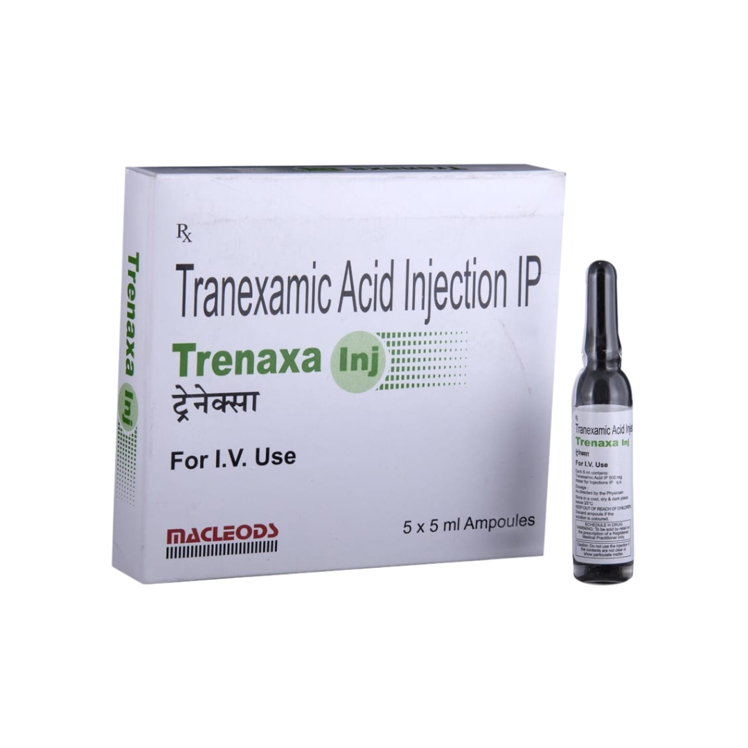 Trenaxa Injection is used to treat bleeding. It helps to prevent or reduce bleeding in conditions like tooth removal, heavy periods, dysfunctional uterine bleeding, nosebleed, and in any oral, prostate, or bladder surgery.Trenaxa Injection is an anti-fibrinolytic. It works by preventing the breakdown of clots which leads to the stoppage of bleeding. This injection must be administered under the supervision of a healthcare professional. You should not take it if you have any known allergy to this injection.