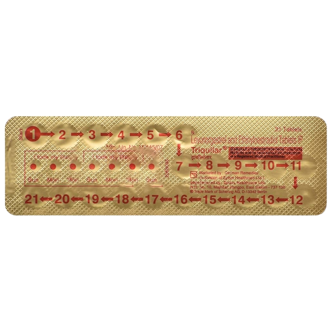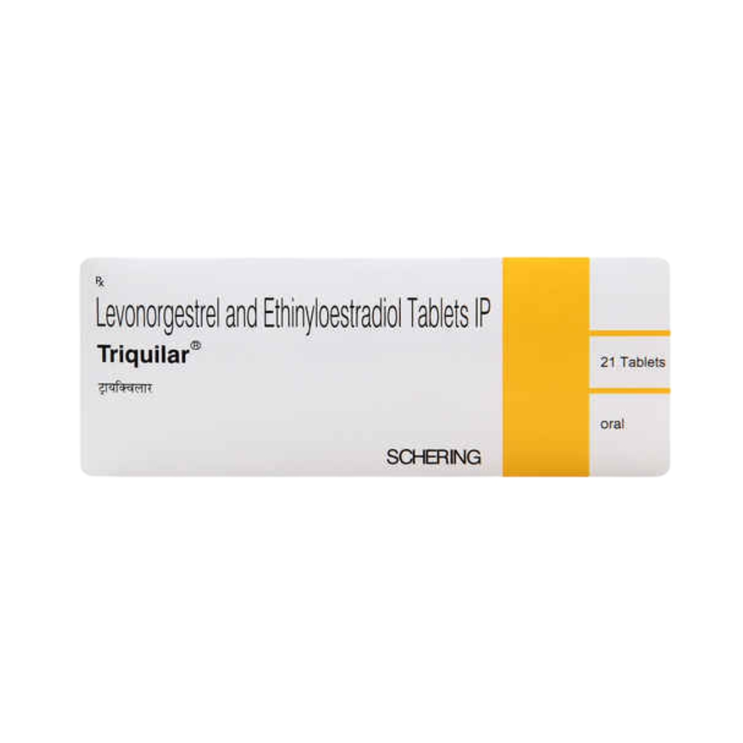 Triquilar Kit is a contraceptive medicine that stops you from getting pregnant in multiple ways. Firstly, it prevents an egg from being released from your ovaries. Secondly, it makes the fluid (mucus) in your cervix thicker, which makes it more difficult for sperm to enter the womb. Additionally, it prevents thickening of the lining of your womb, thereby making it unfavourable for an egg to grow in it. Triquilar Kit is a reliable and safe method for contraception, if used correctly. It does not interrupt with sex and you can lead a normal routine life without any worries. Take it as directed by the doctor to get the most benefit.
